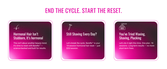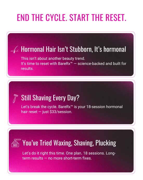 Conditions like PCOS and hirsutism often lead to deep, coarse, recurring facial hair that cycles differently than typical growth patterns. That’s why BareRx™ includes: