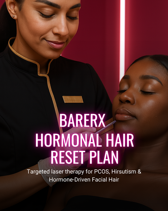 BareRx™ is a specialized 18-session laser treatment plan clinically designed to address hormonal facial hair caused by PCOS, hirsutism, or hypertrichosis. This isn’t your average hair removal package — it’s a medical-style protocol that targets the root of androgen-fueled growth patterns with consistent, corrective care.