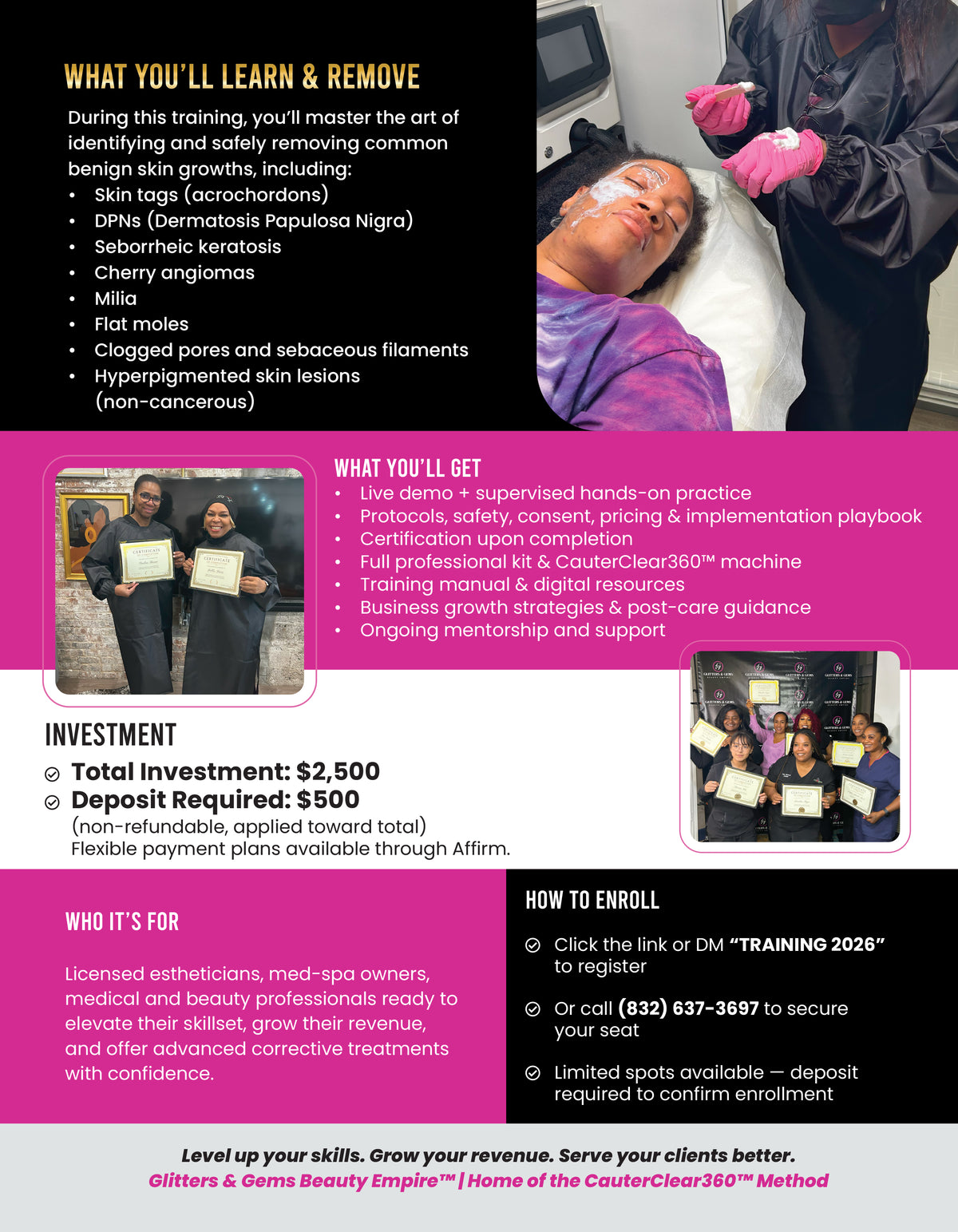 DPN/Skin Tag Removal Training provides you with essential knowledge and skills in the removal of skin growths. The training covers identifying different skin growths, treatment settings, sanitization protocols, trolley setup, and pre/post-care instructions.